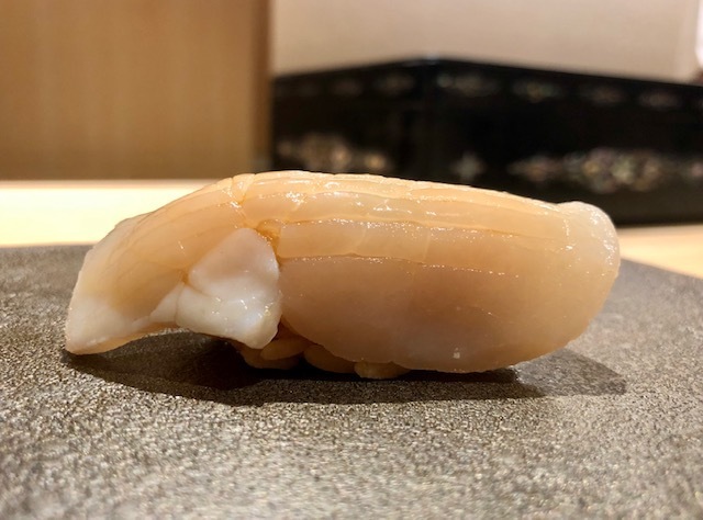 シャリに柚子の香りをつけて握られる平貝は食感もさることながら、実に香りがいい。
