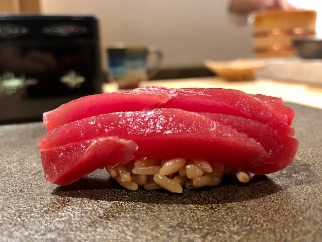 漬けにすることで旨味がギュッと凝縮して、更に美味しい。鮪の供する順番にも職人の個性がありますが、個人的には中トロ→大トロ→赤身漬けが味わいの流れ的に好き。