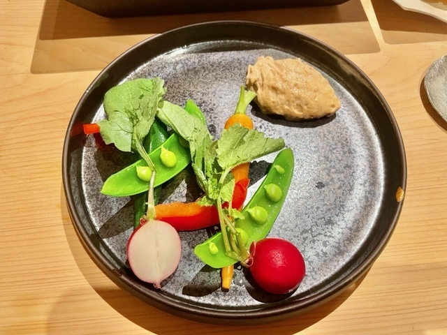 カブ・コリンキー・オクラ・紅芯大根・水茄子。2種類の味噌とオリーブオイルで作られた自家製ソースが美味しい。