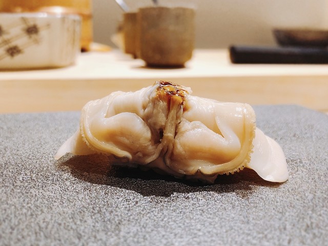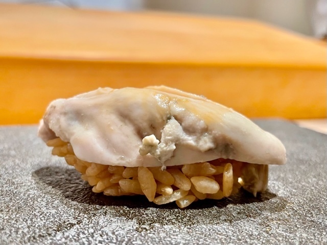 北海道昆布森産。どっしりとした旨味のある牡蠣は意外にもこのシャリによく合っており、美味しい。