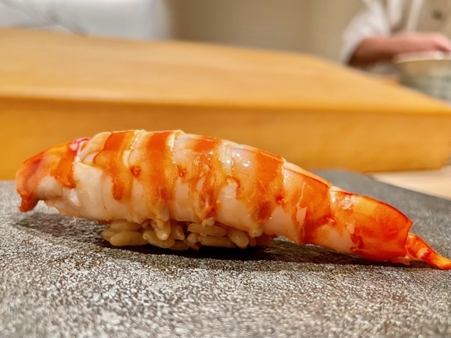 半生よりも火を入れて人肌まで落ち着かせた車海老。海老味噌は使わずに身の旨味だけで勝負の一貫は、強烈な甘味と香りが美味しい。