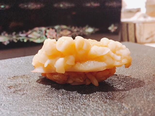 北海道噴火湾産。毛蟹の旨味が食べた瞬間にグッときて、コレもシャリの塩味でより甘味の輪郭がはっきりとします。