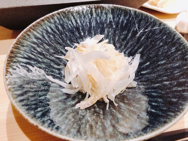 「河豚の女王」と称される真河豚を使った昆布〆。小気味良い食感があり、咀嚼の度に昆布の香りと真河豚の甘味が溢れてきます。