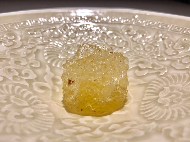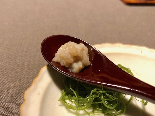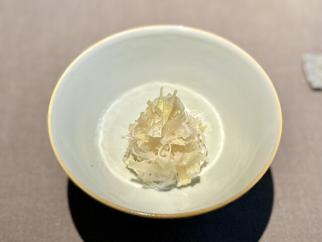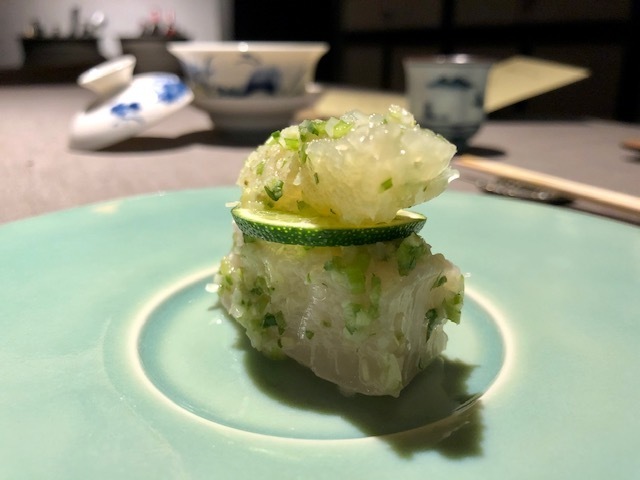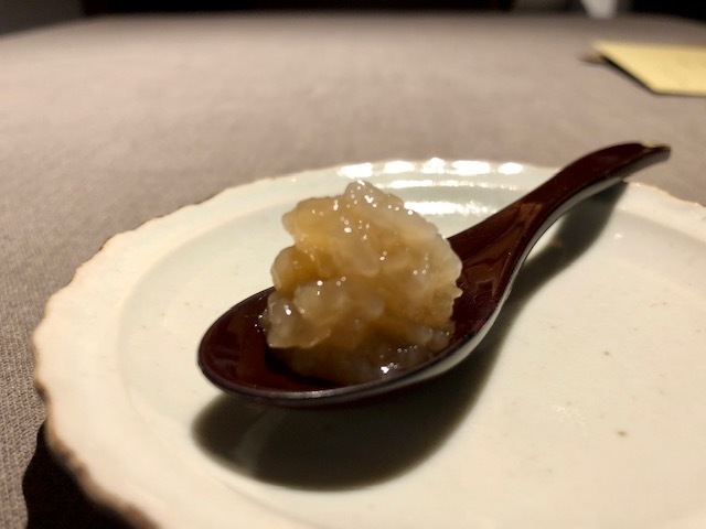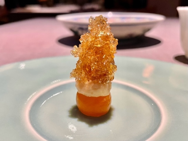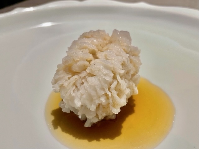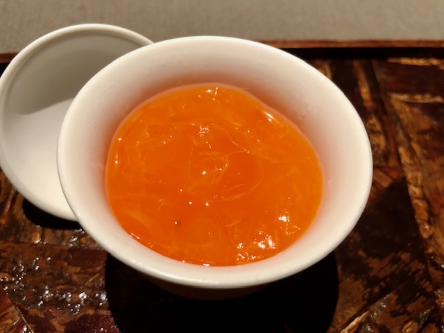 酢橘の爽やかな酸味の中で、食感の違う海月の頭と胴の部位の小気味良いコリコリとした食感とねっとりととろけるキャビアの旨味と甘味が最後に口の中に溢れます。何度もこの料理はいただいていますが、過去イチの美味しさ。「清香鉄観音」で、この料理にはない爽やかな香りを楽しめます。