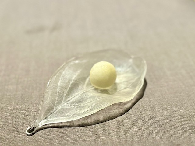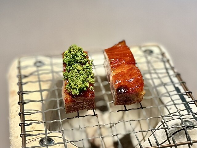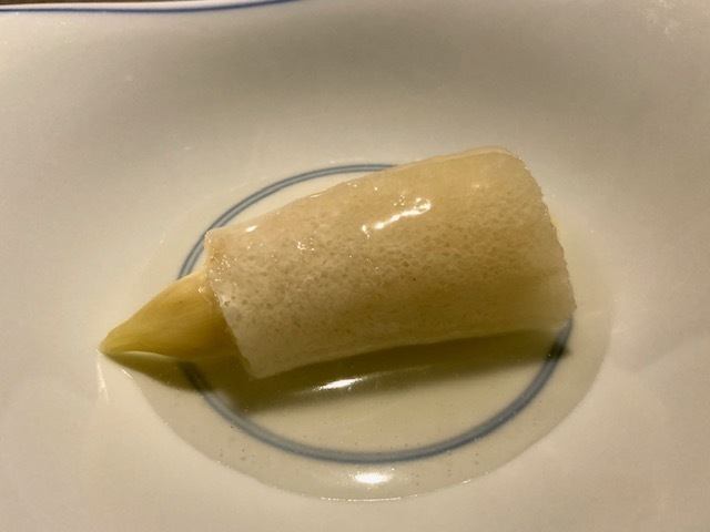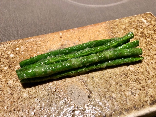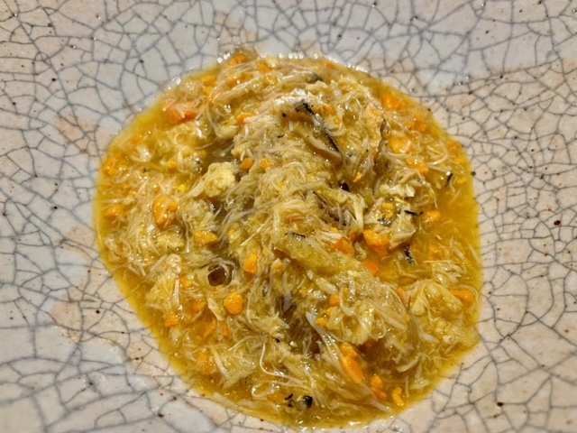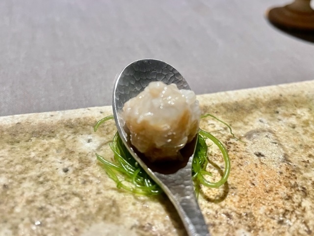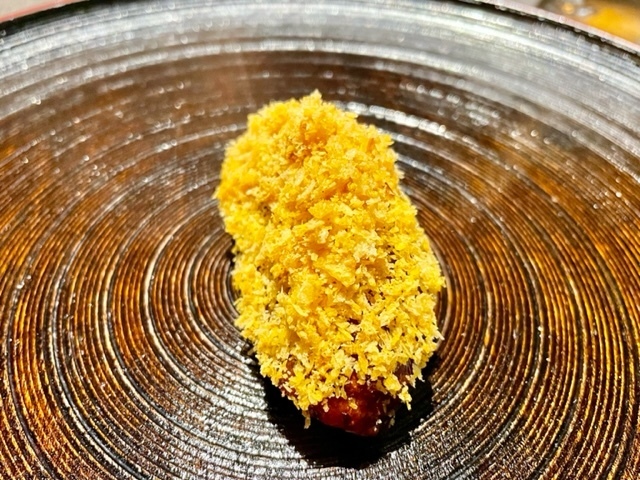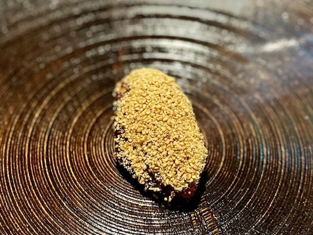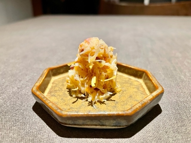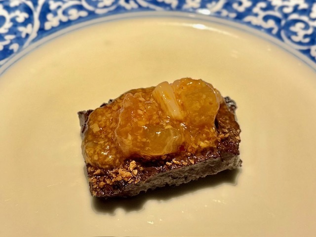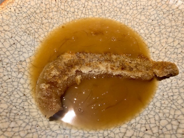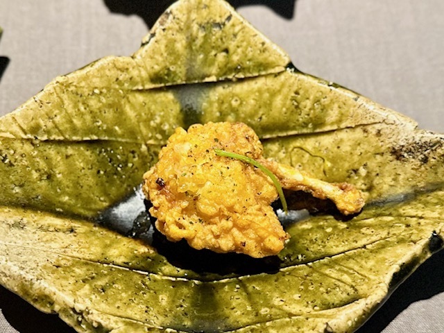 米粉の衣を纏った赤むつ。手前からいただくと、「コレは液体か?」と錯覚してしまうほどのとろける純粋な赤むつの味わい→鮮烈な山椒→爽やかな柑橘と味わいの変化を楽しめます。個人的には、最後の柑橘がとても好みでした。