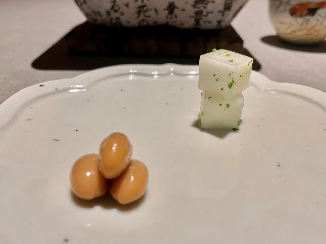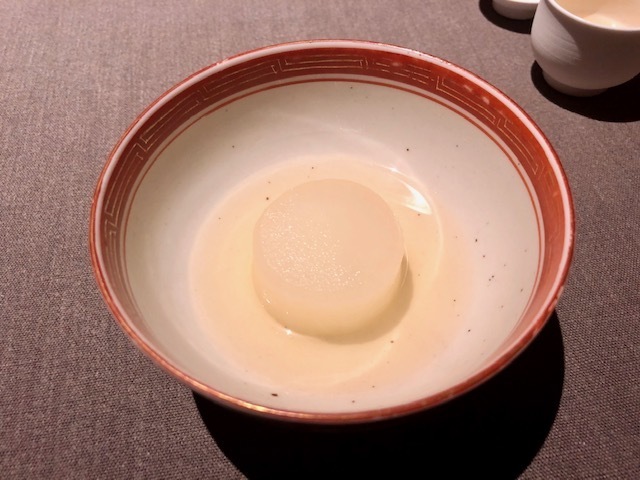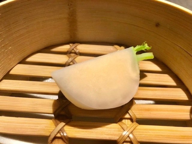 このお茶が供されると分かる。今日の野菜は、きっとアレ。蒸篭を開けると、蒸した蕪があり、その蕪に金華ハムを半分だけに削りかけ、残りは富乳ソースでいただきます。