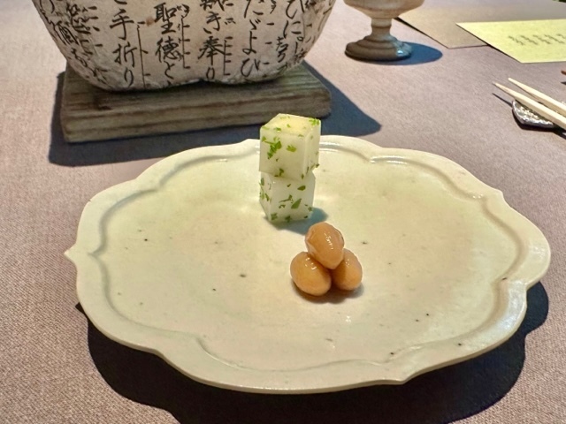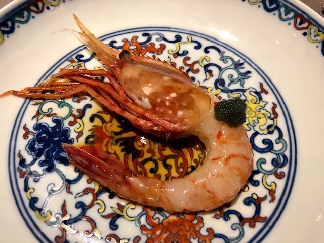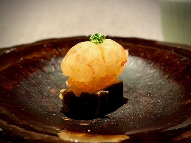 舌に絡みつくようなねっとりとした牡丹海老の甘味を堪能した後に、むっちりとした鮑と共にいただくと牡丹海老の甘味にプラスされる鮑の香りをより感じられて、美味しい。ペアリングする「京都玉露」をいただけば、爽やかな甘味が駆け抜けていきます。
