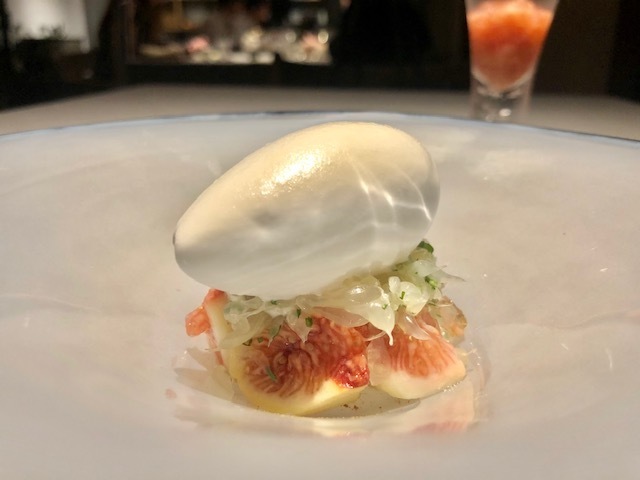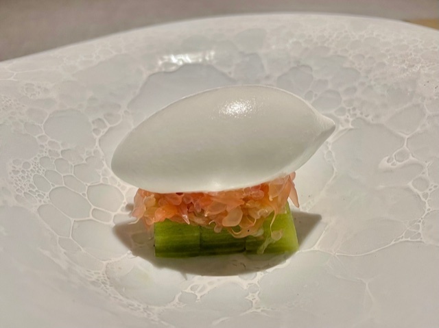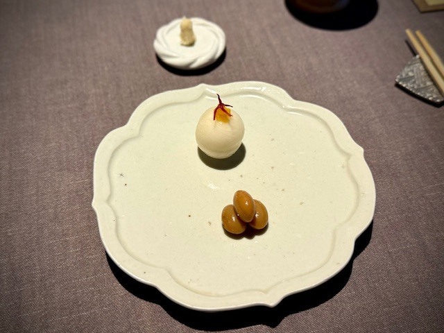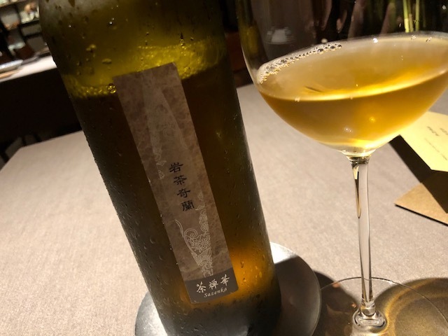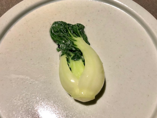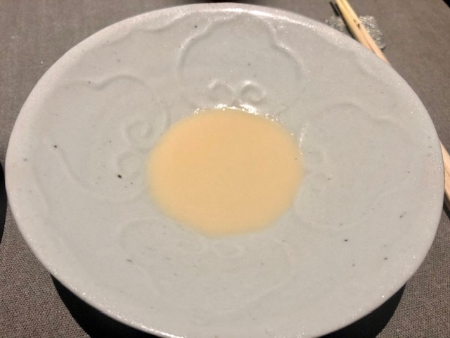 ペアリングする「泡番茶」が供された時点で分かるこの料理。蒸したての蕪を富乳ソースでいただきます。でもまずは蕪に金華ハムを削りかけて、そのままで。次に富乳ソースにつけていただき、「泡番茶」を飲めば…蕪の甘味・富乳ソースの酸味・泡番茶の苦味で、まるで漬物のように感じられます。野菜料理の中で、コレが一番好きです。