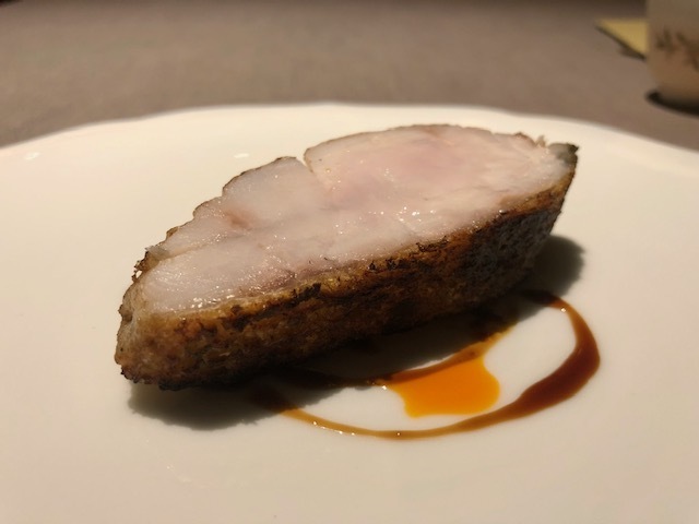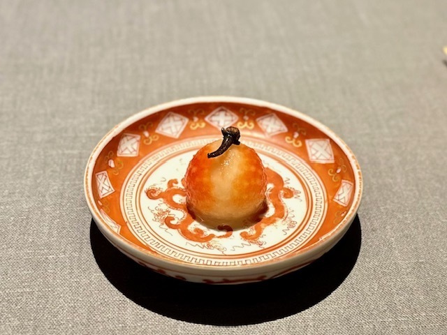 鱧の甘味と旨味が全面に出されており、川田さんにしかできないであろう中国×日本の融合を感じさせるひと皿。後から供されたカボスを効かせたXO醬を乗せていただくと、旨味と酸味が加わって更に美味しい。どっしりとした旨味とフルーティーな香りの「梨山」が心地よく響きます。