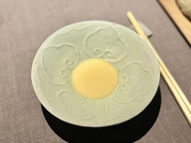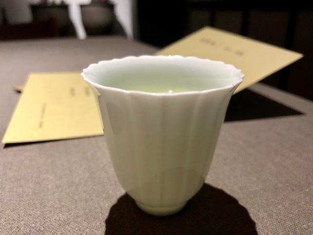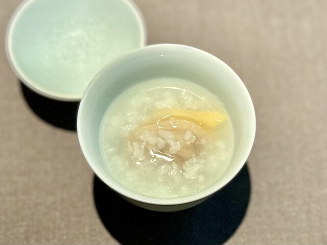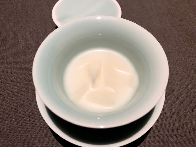 最初のひと口目には鱧があり、口の中で鱧の旨味とぶわっと爆ぜるような松茸餡の香りが凄い。そして、最後のひと口は松茸の食感を残しており、より松茸の芳香が鼻から抜けます。ペアリングする「独木春」という普洱茶のふわりとした苦味がこの料理を締めています。