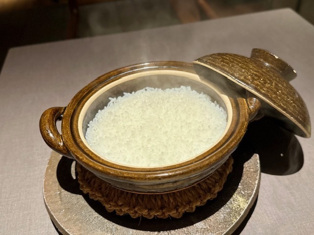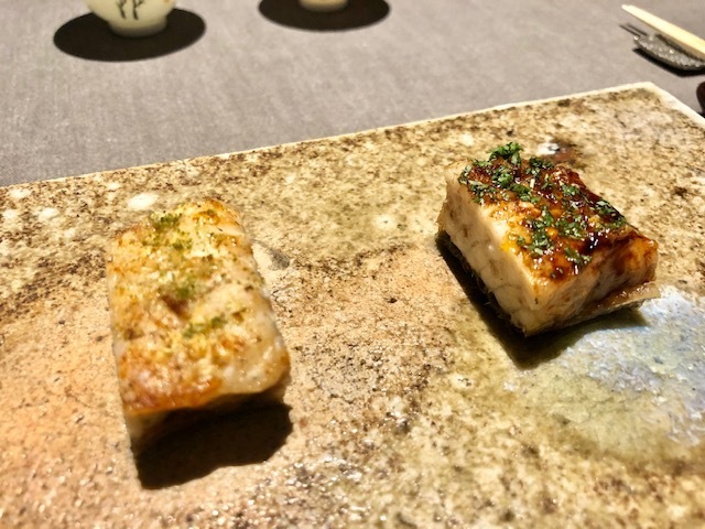 滋賀県琵琶湖産の鰻を使ったひと皿で、右の白焼は胡瓜、左のタレ焼はなんと蟹玉と一緒にいただきます。肉厚な鰻は身のブリブリ感を感じてると、皮目のパリパリ感が現れ、食感のコントラストが完璧。右の胡瓜は実に爽やかさをプラスしますが、驚くべきは左の蟹玉。めちゃくちゃ美味しい。イメージ的には右が鰻ざくで、左が鰻巻きだそうで、川田さんの発想力に脱帽です。