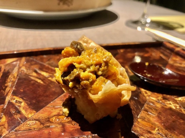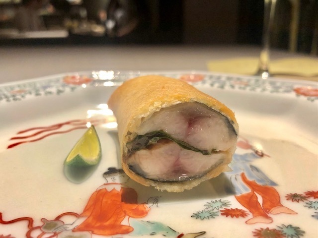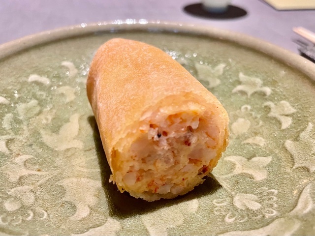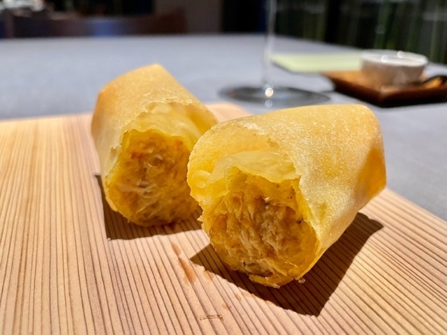 鱧と松茸の春巻で、手前からふた口で食べることを勧められます。