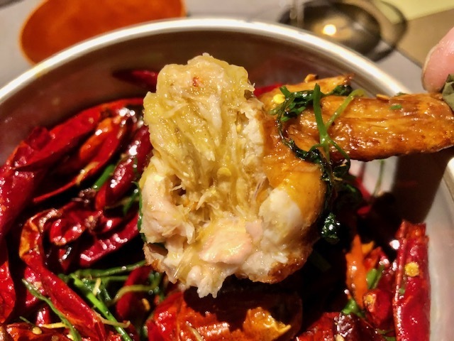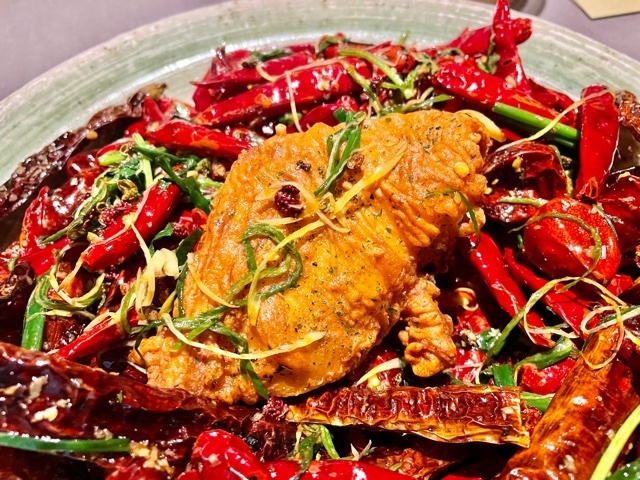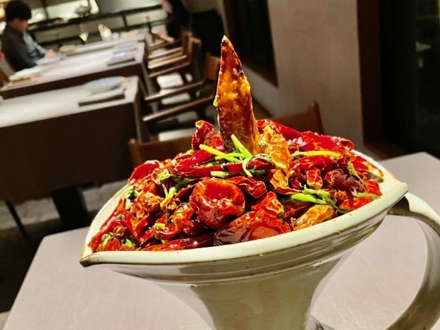 大量の唐辛子の中に埋まっているのは、脆皮手羽先。今夜は2種類があり、中には新銀杏と蟹玉が詰められています。