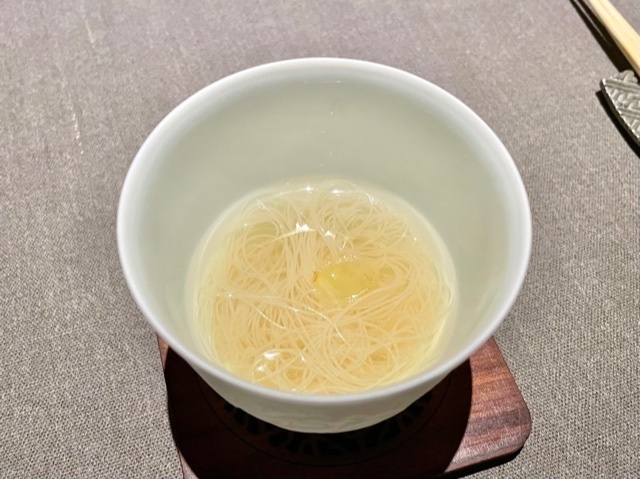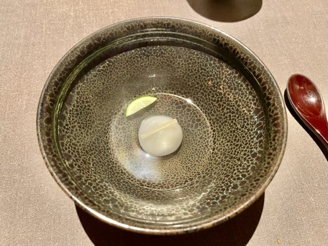 供されると、冬瓜の爽やかな香りが立ち上り、地味深い旨味の中に溺れていきそうな雉スープの美味しさに一気に持ってかれます。後から青柚子を振った冬瓜の中心部と毛蟹を入れると、またスープの表情ががらりと変わり、冬瓜の奥深い甘味と毛蟹の濃厚な甘味が映えます。