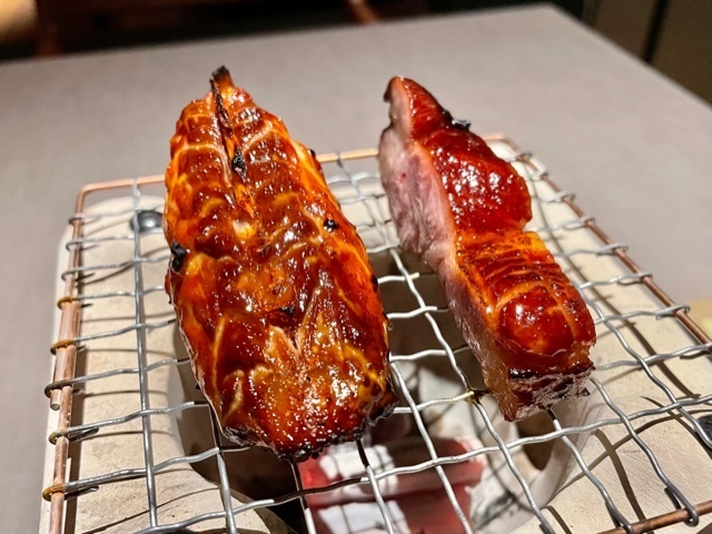 口に入れると、蜜の甘味だけでなく、豚の脂と甘味がジュワッと口いっぱいに溢れます。いつもながらに素晴らしい美味しさ。ペアリングする「半天妖」をいただけば、口の中の脂を断ち切る一陣の風が吹き抜けるかのような爽やかさ。