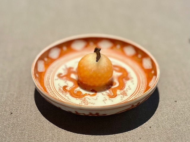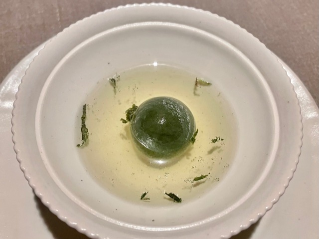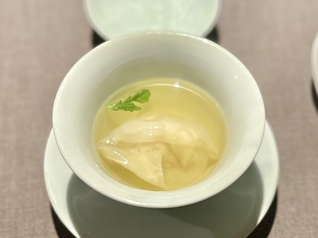 青柚子をくり抜いた中に、食感の違うクラゲの頭と胴の部位を入れたひと皿。温かい「碧螺春」を飲むことで、仄かな甘味を感じさせ、食べ終えても残る旨味が素晴らしい。