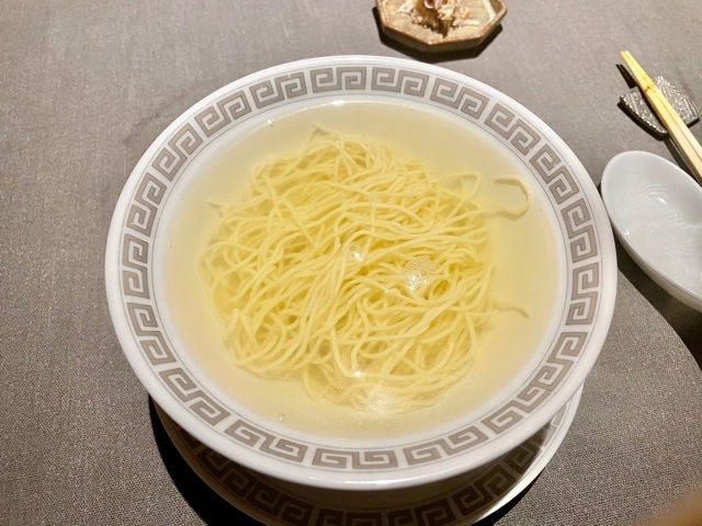 〆はシンプルな清湯麺。先程の『煨魚翅麵』との対比を楽しめ、奥深い旨味が何よりも美味しい。