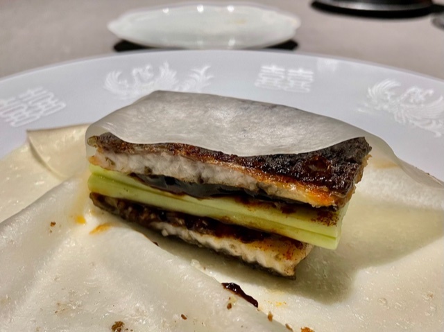 松茸は軽く炙ってあるそうで、豚の旨味と脂を吸い込んでおり、実に美味しい。同じ厚さに仕立てられた豚肉と松茸は茄子のものは違い、口の中でとけるのではなく、豚肉の「粘」の中に松茸のコリッとした食感が映えて美味しい。しかし、まさか1人で来て、「茶禅華雲白肉片」の食べ比べができるとは。用意して下さったことに感謝しかありません。