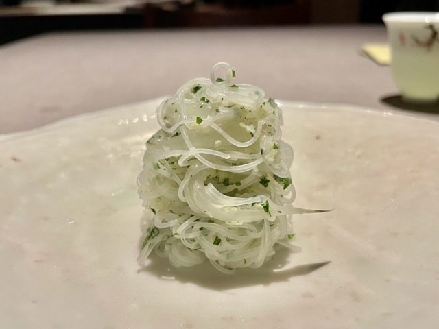 冷たい鶏出汁に青トマトとビーフンを合わせたもの。口を近づけると、大好きなトマトの青い香りが鼻をくすぐり、口に入れると山椒の鮮烈さが広がります。まだまだ暑い中で、とても涼やかな味わい。