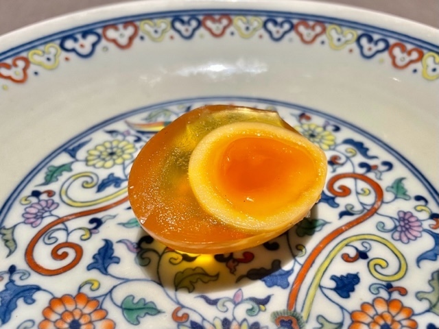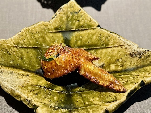 手羽先の中には秋の食材である新銀杏が詰められており、心地よい「麻」「辣」の刺激の中でも季節感を感じられます。驚くのは、初となる手羽先。衣はパリッとしているのに、肉は信じられないくらいに柔らかでジューシー。鶏ではなく、ある調理法だと仰るが…。