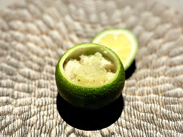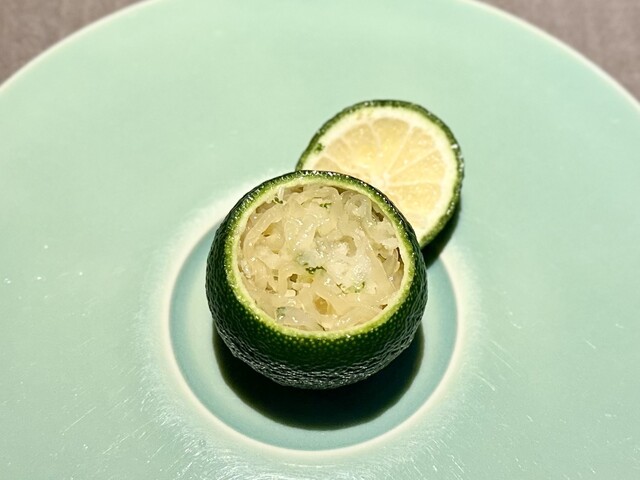 中をくり抜いた酢橘のなかには、中国・浙江省のキャビアと海月。蓋になっている天辺の部位をちょっと搾っていただきます。