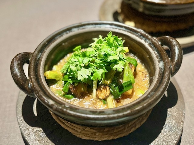 ダイニングの客の視線を一点に集めて供される一際大きな皿。蒸篭を取ると…「茶禅華」の名物の1つである『雲白肉片』が秋の時期ならではの進化を遂げ、なんと茄子の代わりに松茸を使ったものに。薄切り豚肉に合わさる茄子のとろけるような食感も捨てがたいですが、この松茸のシャキシャキとした食感が新しくも美味しい。松茸はブータン産だそうですが、香りや食感も上質。「茶禅華」の秋の新しい名物になりそう。