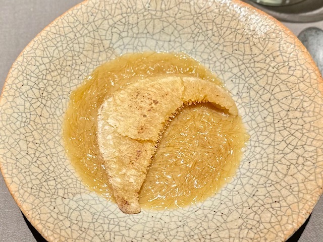 「アバンギャルドな盛り付けですが」と供された表面をカリカリに焼き上げたフカヒレを「ほぼ松茸?」と思える松茸餡で。