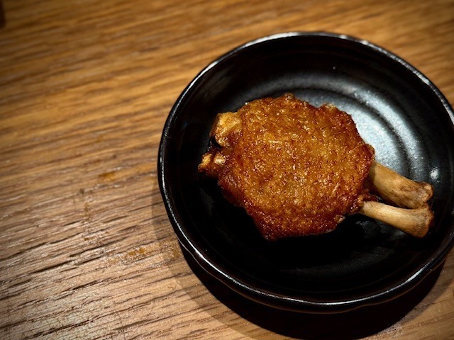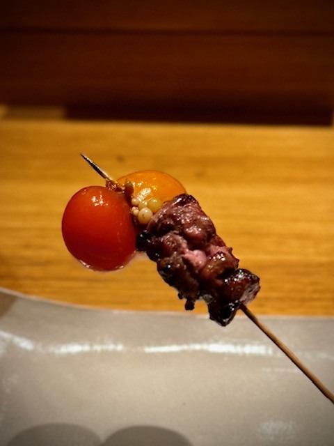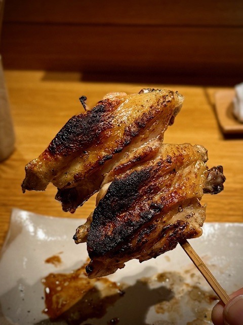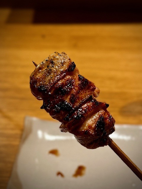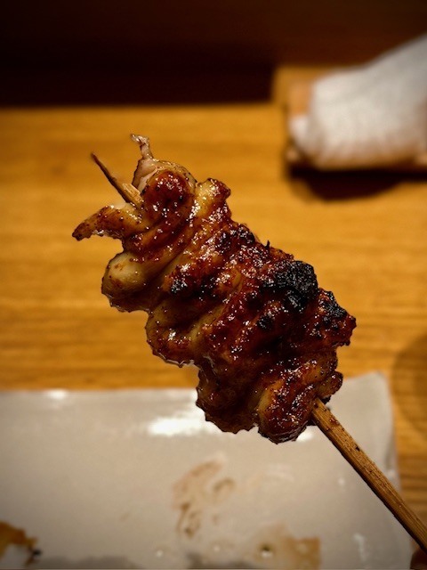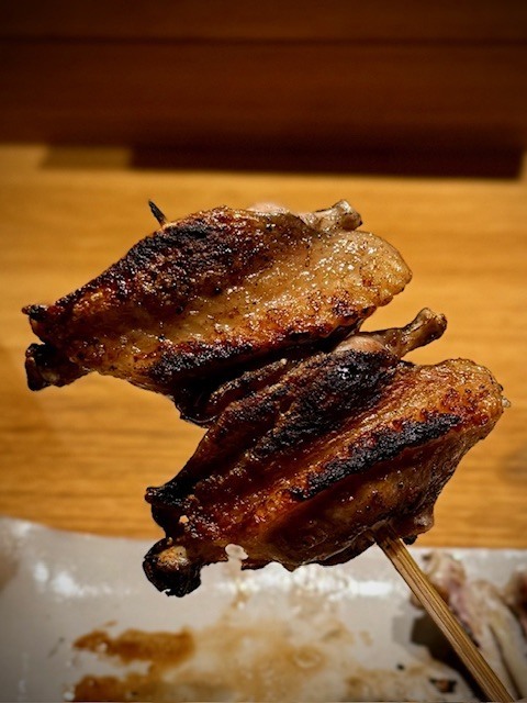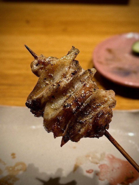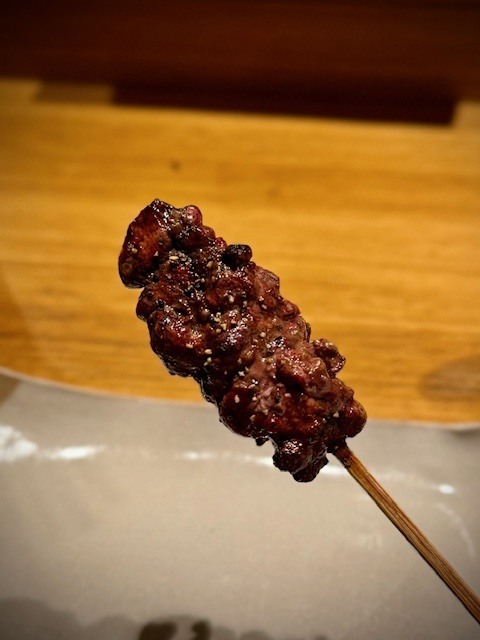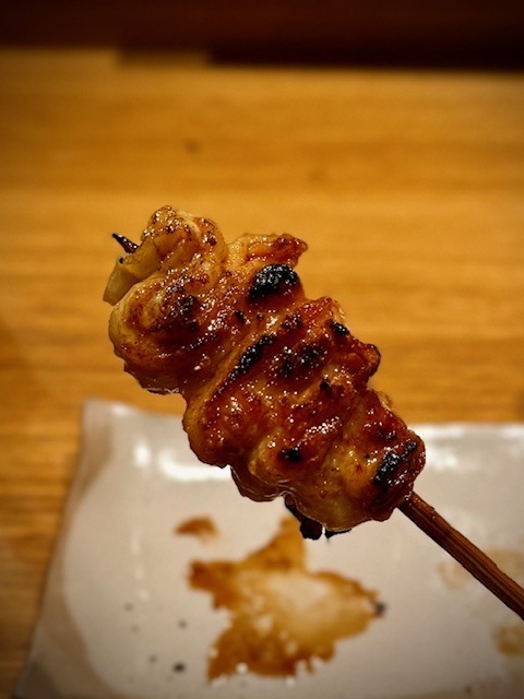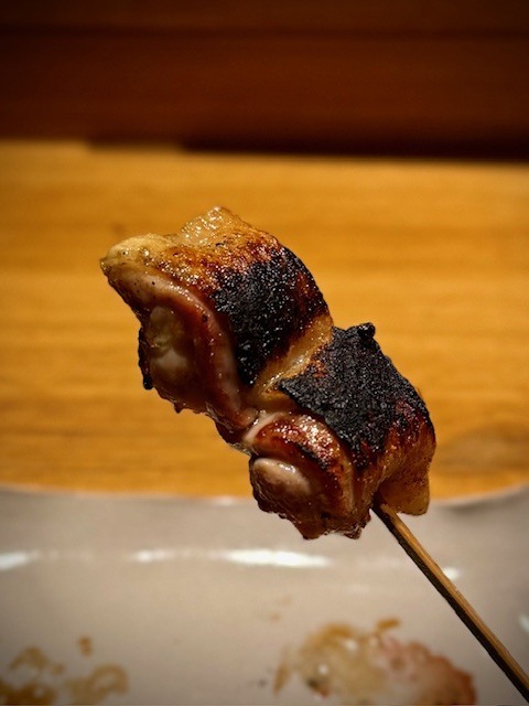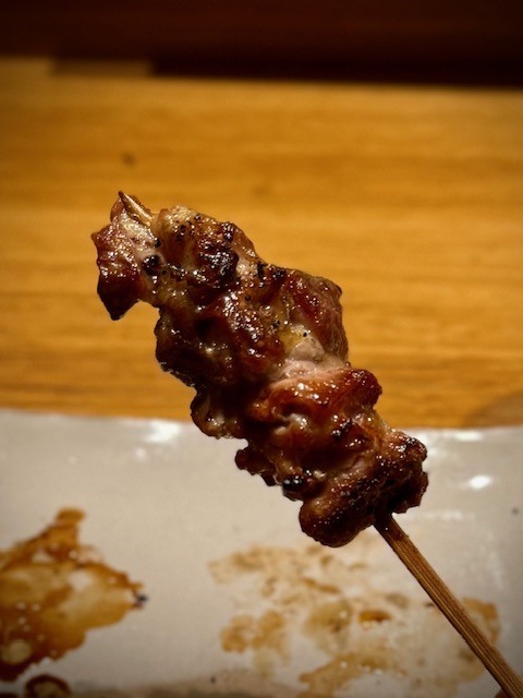 内腿の部位で、串を持つと滴るジューシーさ。咀嚼する歯の角度によって食感が変わるのか実に面白く、そして美味しい。