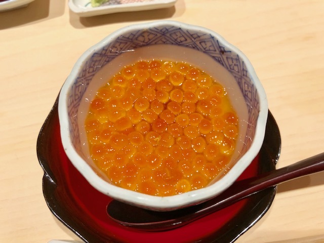 香箱蟹の身と内子と外子を全て混ぜて、少量のシャリを加えたものの上からいくらを乗せた贅沢な逸品。身の甘さといくらのプチプチと弾ける食感、外子の心地よい歯応えがたまらない。