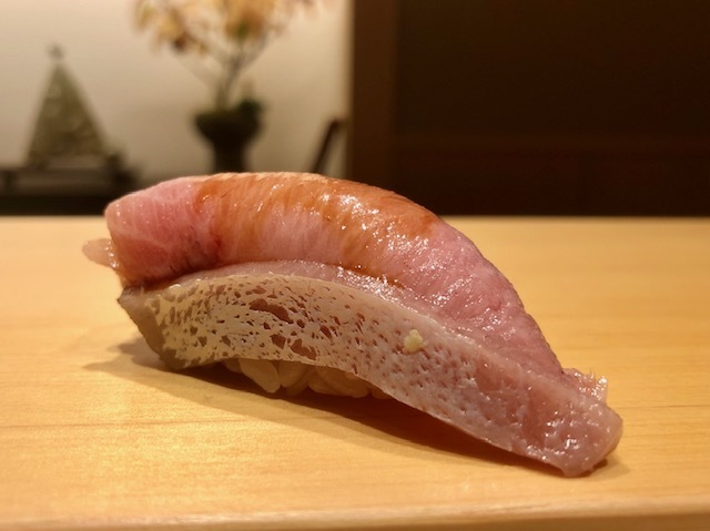 禁漁明けの千葉県勝浦産。皮目の多い部位を握っていただきました。濃厚でありながらもさらりとした脂の旨味は最高です。追加して後悔なしの味わい。