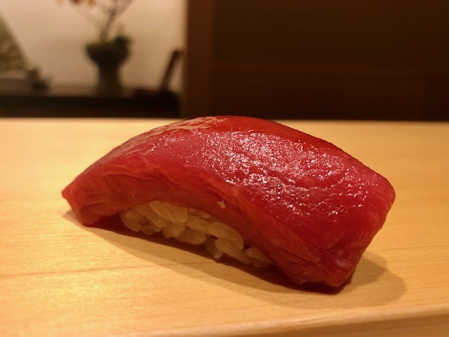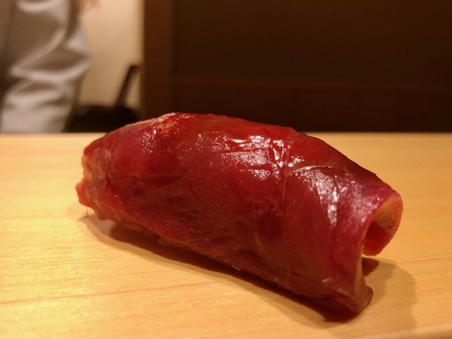 青森県三厩産。赤身とは思えないほどに脂を感じる赤身。食べ終えても続く香りは素晴らしい。