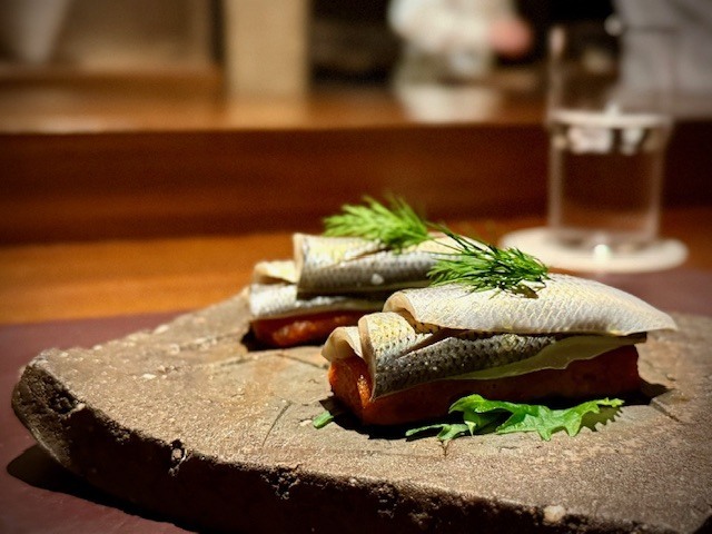「aca1°」を象徴する料理のひとつである小鰭を使ったボカディージョ。京都から日本橋に移転する際に日本橋ならではの食材として小鰭を選んだという。鮨以外で小鰭を美味しく食べられるのは、この料理しかないと思います。