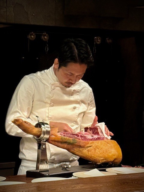 東さんが原木から切り取る生ハムを揚げたての紅はるかのクロケッタに乗せたひと品。