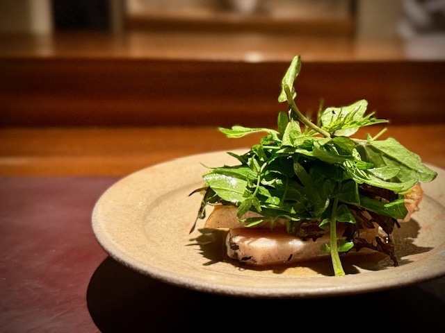 京都から日本橋に移転する際に、この日本橋を代表する料理として東さんが考案されたもので、鮨にしか活きないと思われた小鰭を見事にスペイン料理へと昇華した傑作。トマトを練り込んだパンコントマテの旨味に、シェリービネガーでマリネし、酸味を纏った小鰭の旨味が絶妙に合います。