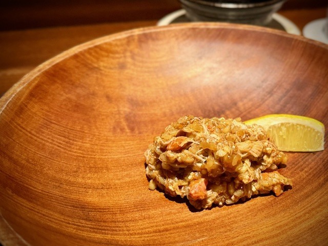 アラブラサとは薪焼きの意味だそうで、絶妙な火入れで驚きます。マナガツオにさほど薫香は感じられず、薪はどんな種類なのだろう?マナガツオは色気のあるほんのりとしまピンク色でふわりとして、縁側の部位はとろけるよう。その中でレンコンのシャキシャキとした食感と酸味が合わさり、爽やかな味わいです。