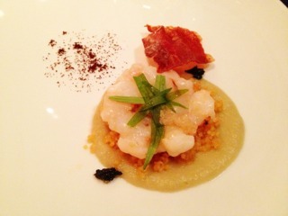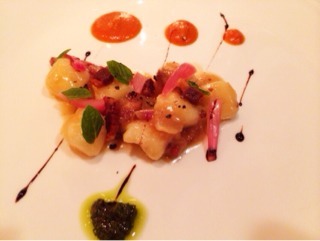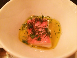 まずは定番。トリュフ香るモチモチとしたジャガイモのピューレに、A5ランクのサーロインを巻いた一口料理。いつもながら素晴らしい始まり。