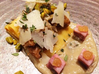 アニョロッティ・デル・プリンというラビオリが口の中で弾けます。生地も折り重なった部分とそうでない部分の食感の違いが楽しく、極濃厚なチーズの中で相反するブラックペッパーとアマレッティの刺激が味わいに奥行きを与えています。この量だからこその実に素晴らしい美味しさ。