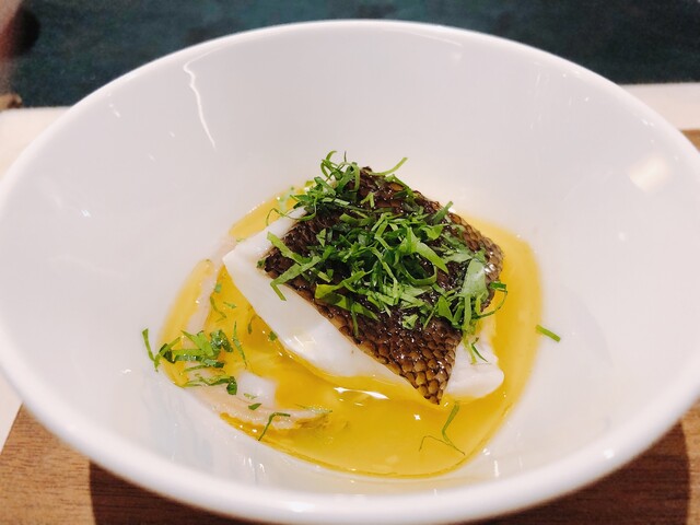 冷たい冷菜は、私をシチリアに連れて行ってくれるみたい。脂がのっている鰆が透明な貝の出汁シートで包まれる中で、シャリシャリとしたウイキョウとカリカリとしたピスタチオの食感が心地よく、オレンジの爽やかな味わいが駆け抜けていきます。