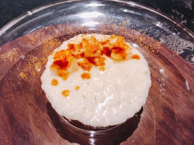 イタリアではクリスマスに鰻を食べるそう。いつも味・香り・食感・見た目を楽しめるワンスプーン料理ですが、今回は燻製したフォワグラを冷やすことで更に温度の違いも楽しめるようになっています。鰻とフォワグラの濃厚な味が混ざり合い、マルサラ酒とトマトがいいアクセント。口の中で完成する料理です。