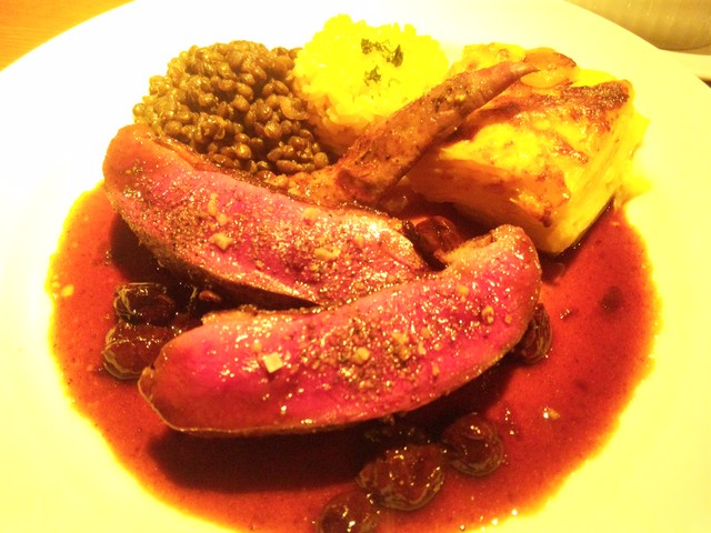 まず出されたのが、色々なジビエをミンチ状にして、ホワイトソースとチーズで焼き上げたアツアツのグラタン。これをパンにつけて食べるのですが、アミューズにするには勿体ないくらいおいしいっ。続いては『羆熊のクラシックなテリーヌ』あまり食べ慣れてないので、熊って固いとかくさいとかのイメージがありましたが、このテリーヌはまったくそれがない。しっかりとした脂、どっしりとした甘みのあるテリーヌは、熟成肉だからこそなのでしょうか。メインの『青首鴨のグリル』にはガルニチュールとして、『ランティーユ』・ 鴨のダシを使った『バターライス』・『ジャカイモのグラタン』がつき、肝心の『青首鴨』も大きくボリューミー。自家製レーズンを潰しながら、いただきます。さて、味わいは…個人的に「ジビエって、固いのでは?」と思ってましたが、脂の部分は引き締まっているという感じで、肉の部分は素晴らしく柔らかで、味が濃い。やはり今が旬のジビエ、食べなきゃ損ですね。次回は猪か鹿、鳩なんかを食べてみたいなぁ。