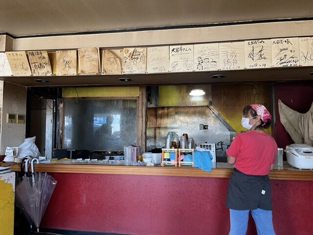 1105頃着。オープン直後だが、まさかの満席で待つことに。店内椅子付きだけどね。夫婦でやってるのかな?しかし外観もボロいが内装もめっちゃボロい。そして店内かなり汚い。きたなうまい店?壁紙がところどころ捲れ上がっている。ワザとやってるのだろうか?灯りも裸電球だし。