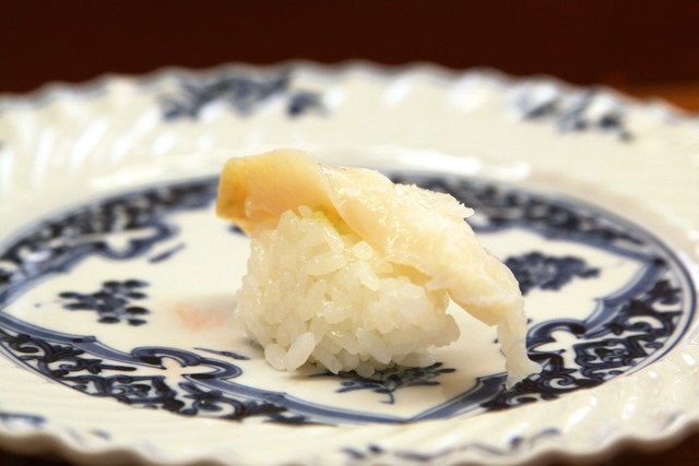 細く刻まれたイカ、大ぶりの炙りトロ、甘エビ、ヒラメ、とネタが順次登場。まだジャブか程度ながら、