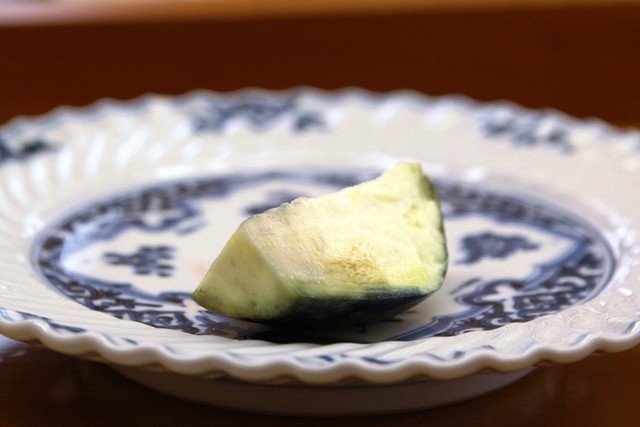 最後に、ばい貝のにぎりと水茄子で一人前は一通り終了しましたが、「狭い思いさせてごめんなぁ。