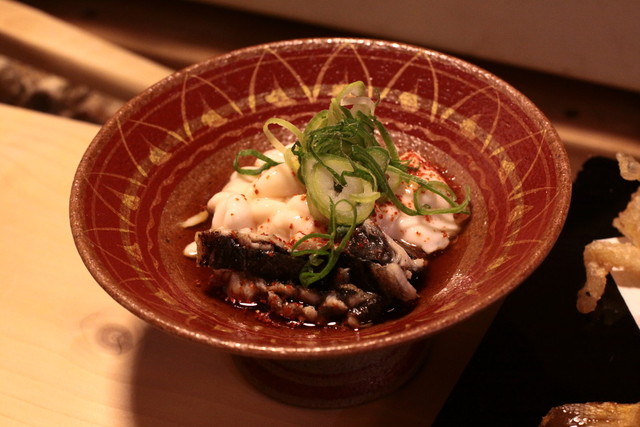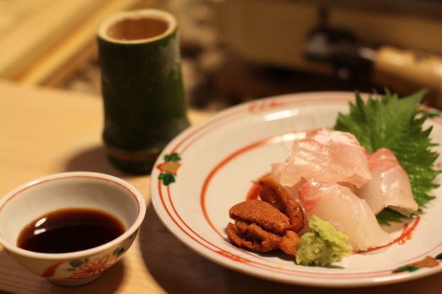お店の名物の竹筒の冷酒(これもおいしいです!)を頂きながら、まずお付き出しと白子ポン酢から。