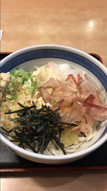 大根おろし、生卵、海苔、かつお、ネギ、天かすを蕎麦と共に混ぜ混ぜ。