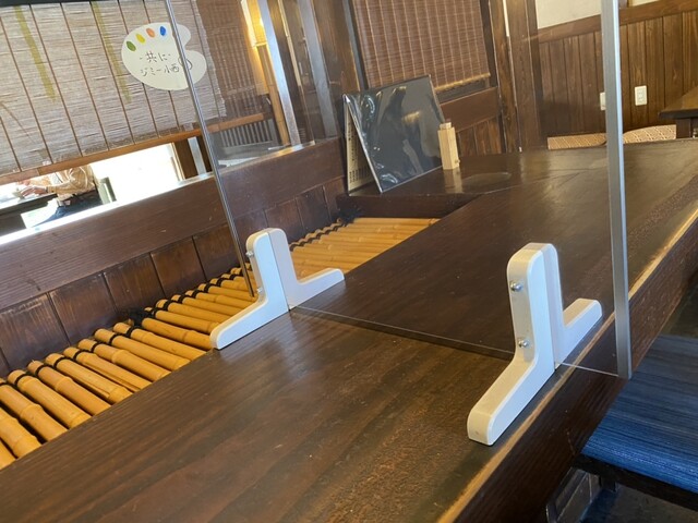 コの字型4人掛けカウンター席は真ん中がアクリルパネルで仕切られ基本両L字型に1名ずつ、2名連れ同士であれば最大4名まで利用出来る造りになっています。