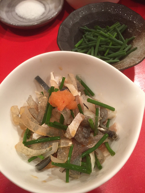 今回は、いつもの水菜サラダ・ふぐとあさつきの和え物・平らぎ貝の磯部焼き・じゅんさい・くじらの刺身をつまみに