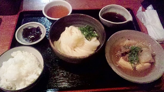 偶然1席空いており、日替りうどん定食を注文。うどんは冷たいのを、そしておかずが肉豆腐なので白ご飯を選ぶ。