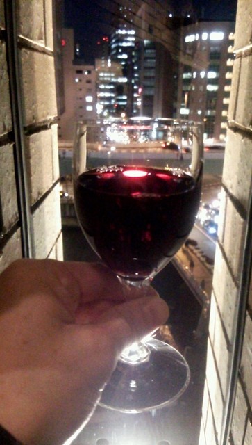 赤ワインのグラス片手に、夜景と公式パンフレットを眺めながらほろ酔い気分。