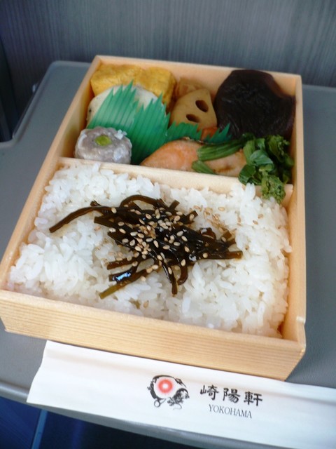 横濱名物シウマイは最後の楽しみにとっておき、鮭(鱒?)の塩焼きや甘めの玉子焼、椎茸や蓮根の煮物などをつまみながら昆布佃煮がトッピングされたご飯を頂く。